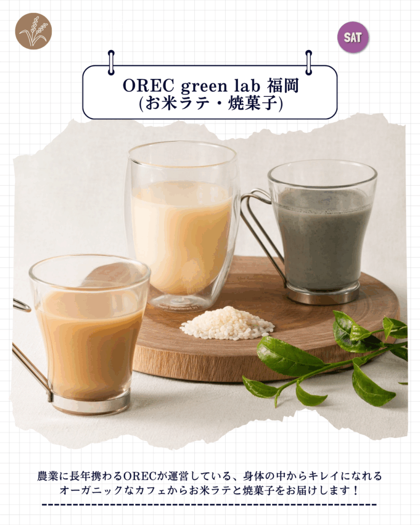 ⚫︎農業に長年携わるORECが運営している、身体の中からキレイになれるオーガニックなカフェより、今回はお米ラテ・焼き菓子をご用意いたします。