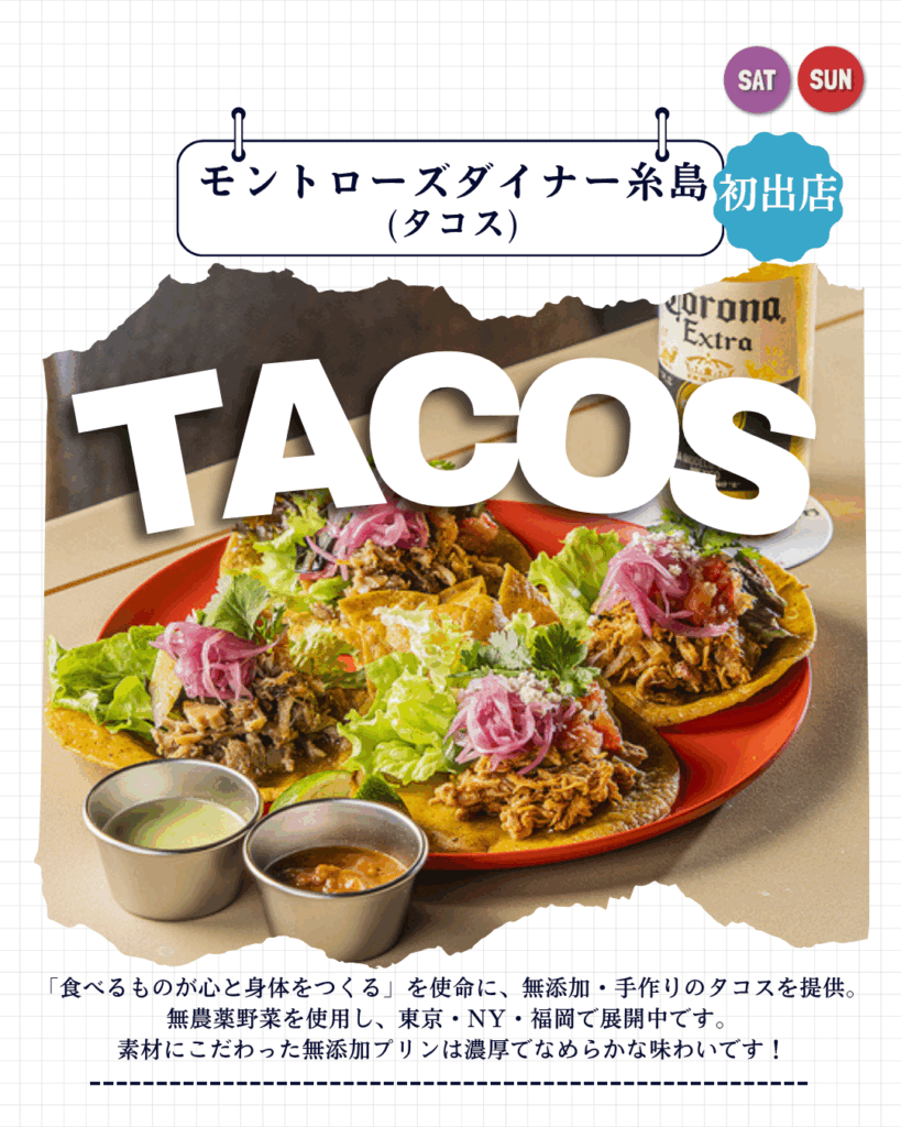 ⚫︎「食べるものが身体と心をつくる」を使命に、無添加・手作りにこだわったタコスを提供するお店。東京・NY・福岡に展開。無農薬野菜とともに安心で美味しい食事をお楽しみください。