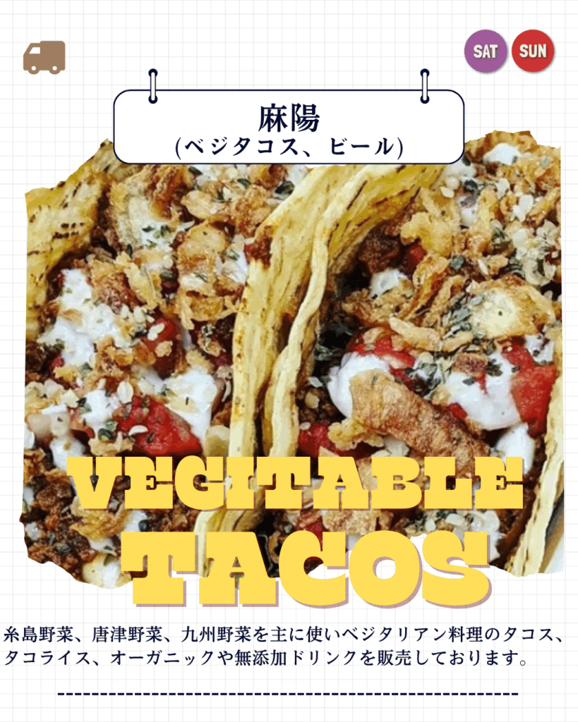 ⚫︎販売商品:ベジタリアン料理のタコス、タコライス、オーガニックや無添加ドリンク