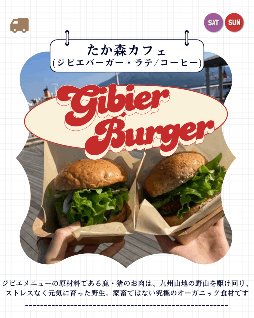 ⚫︎販売商品:鹿肉と猪肉の贅沢ジビエバーガー、クラフトコーラ、黒糖きな粉豆乳ラテ、有機抹茶ラテ、有機抹茶スパークリング、オーガニックコーヒー