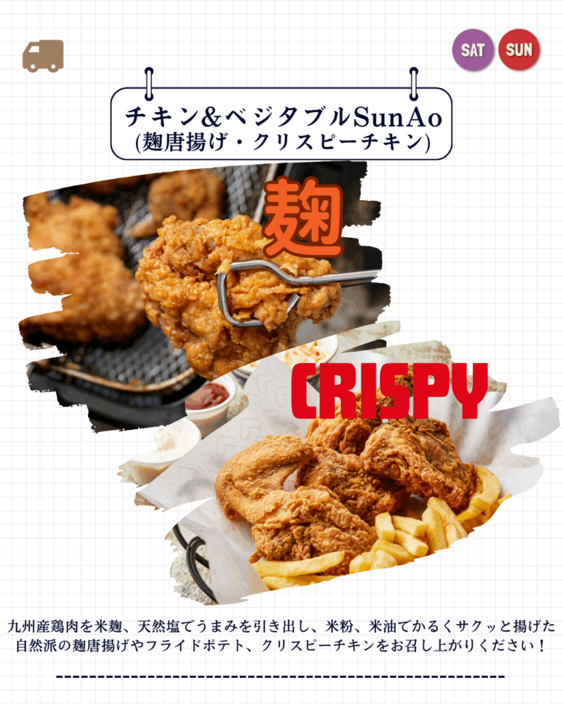 ⚫︎九州産鶏肉を米麹、天然塩でうまみを引き出し、米粉、米油でかるくサクッと揚げた自然派の麹唐揚げやフライドポテト、クリスピーチキンをお召し上がりください!