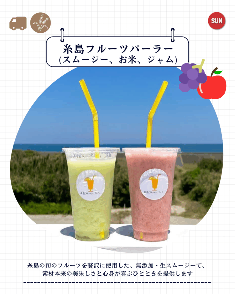⚫︎糸島を中心に、厳選した各地の旬のフルーツを贅沢に使用し、素材本来の美味しさを活かした 無添加・生スムージー で、心もカラダも喜ぶひとときを。