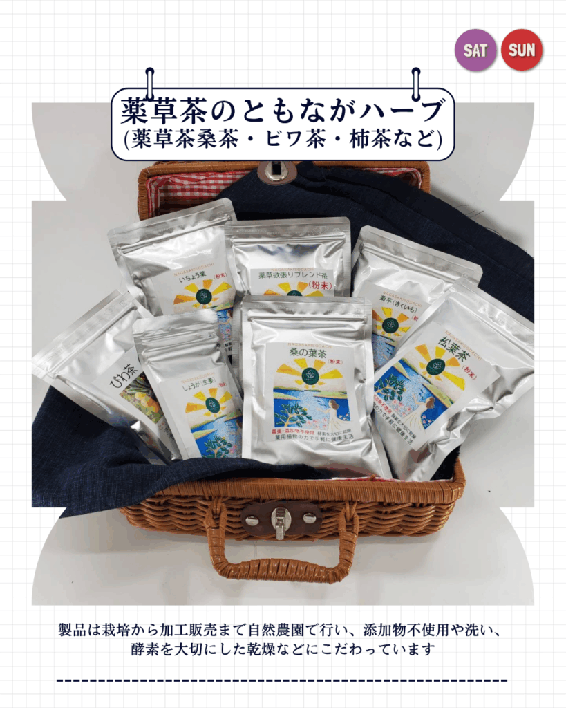 ⚫︎販売商品:薬草茶桑茶、ビワ茶、柿茶、レモングラス、よもぎ、などのお茶