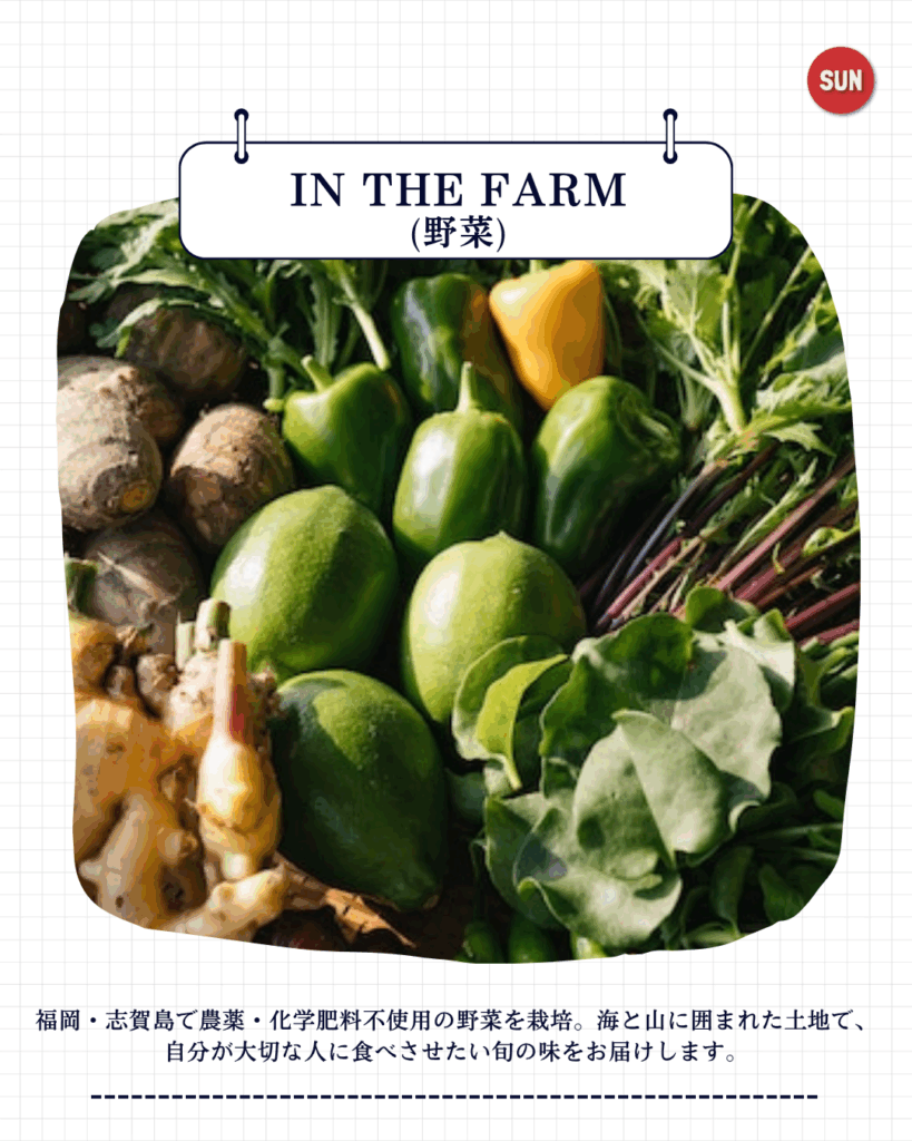 ⚫︎福岡・志賀島で農薬・化学肥料不使用の野菜を栽培。海と山に囲まれた土地で、自分が大切な人に食べさせたい旬の味をお届けします。