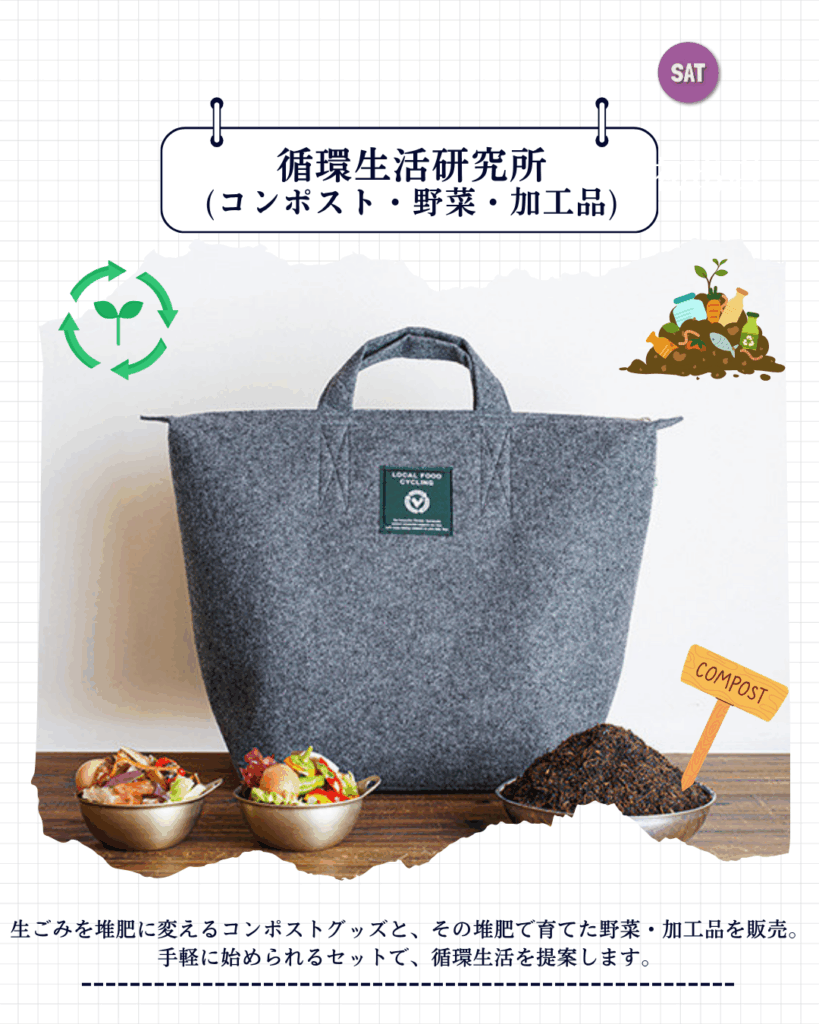 ⚫︎生ごみを堆肥に変えるコンポストグッズと、その堆肥で育てた野菜・加工品を販売。手軽に始められるセットで、循環生活を提案します。