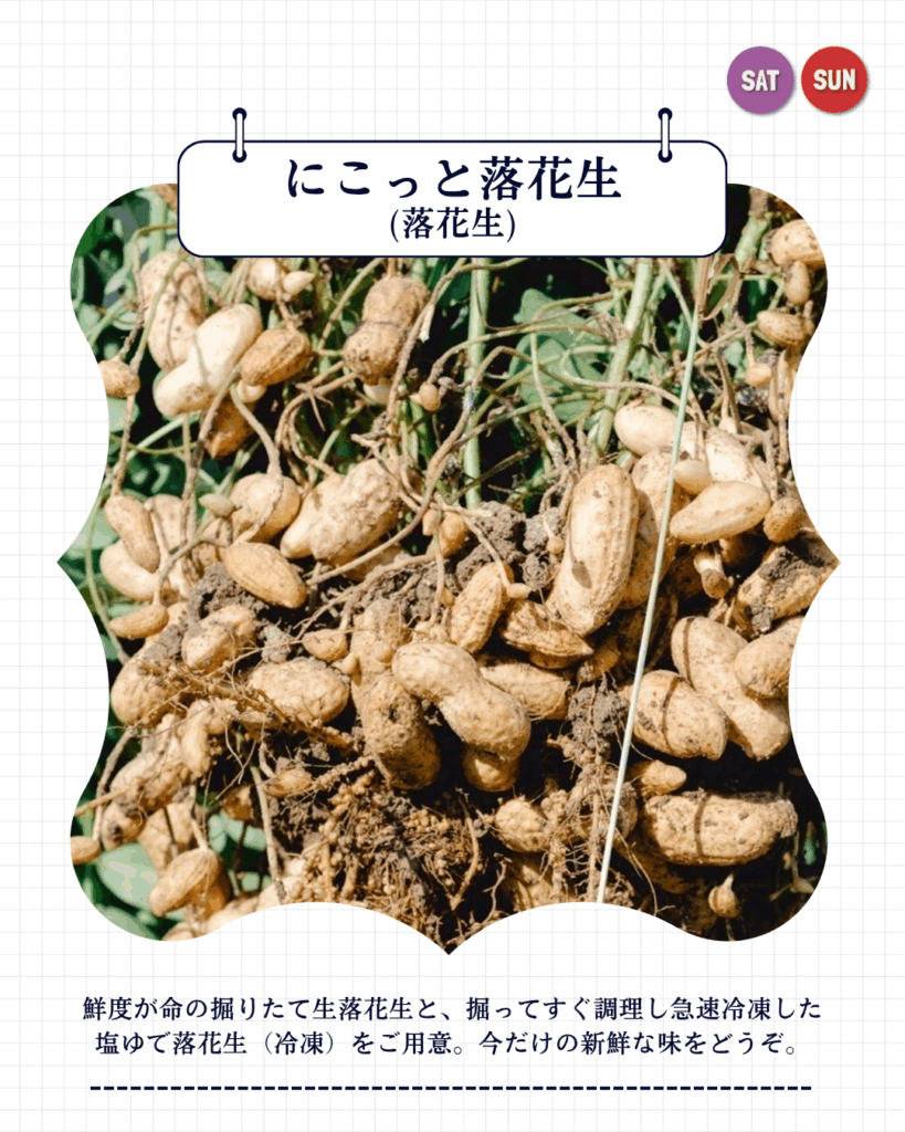 ⚫︎鮮度が命の掘りたて生落花生と、掘ってすぐ調理し急速冷凍した塩ゆで落花生(冷凍)をご用意。今だけの新鮮な味をどうぞ。