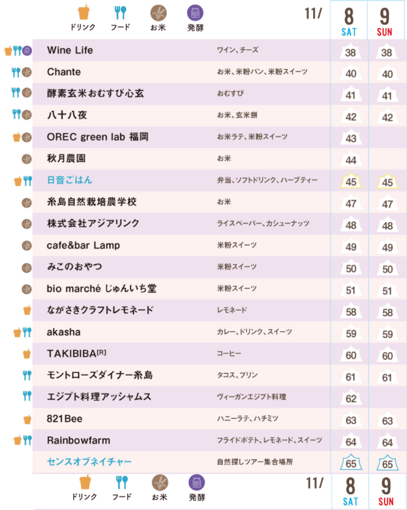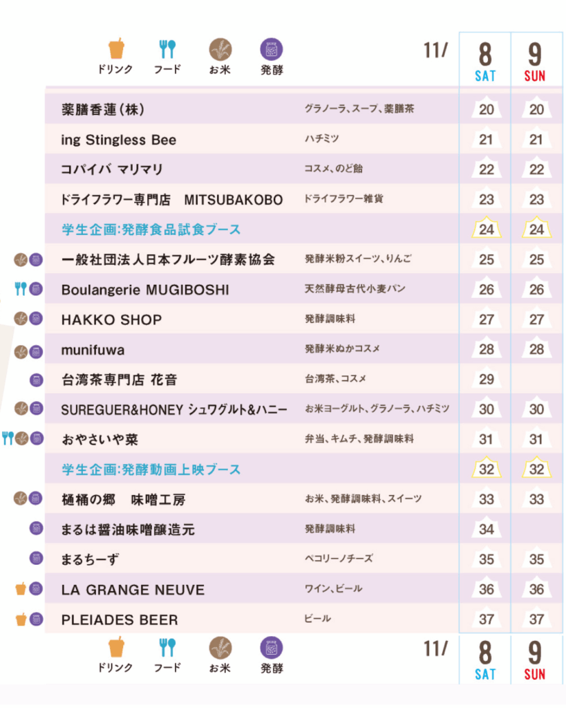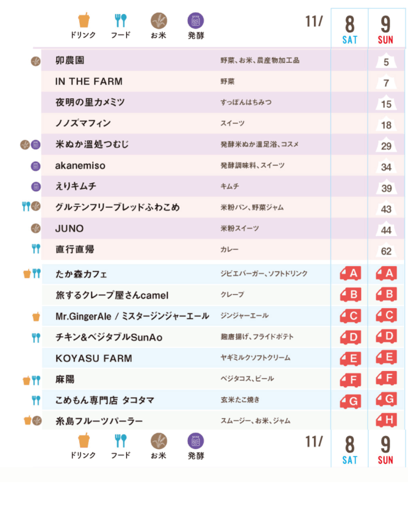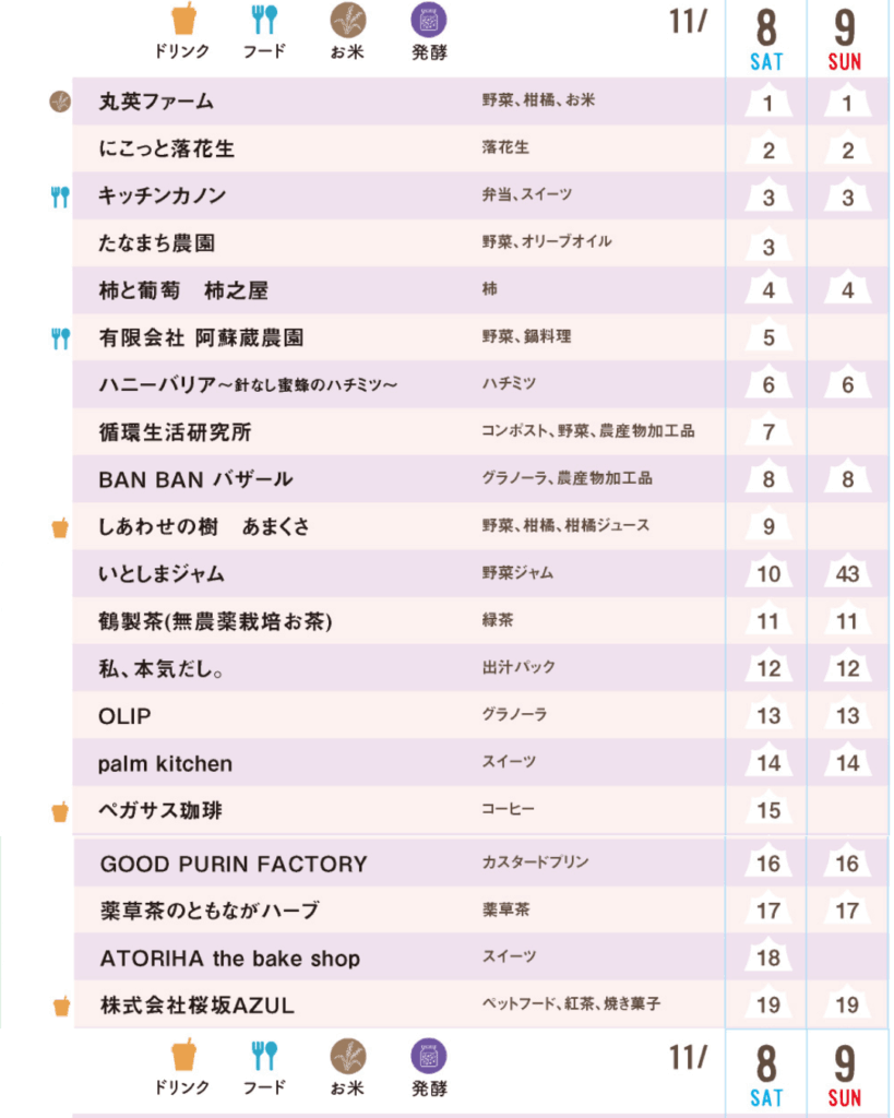 お店によって出店する日が異なります。画像の表で、「8 SAT」または「9 SUN」の列に番号がある日が出店日です。