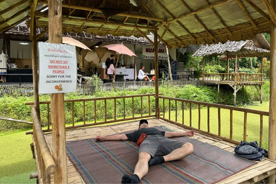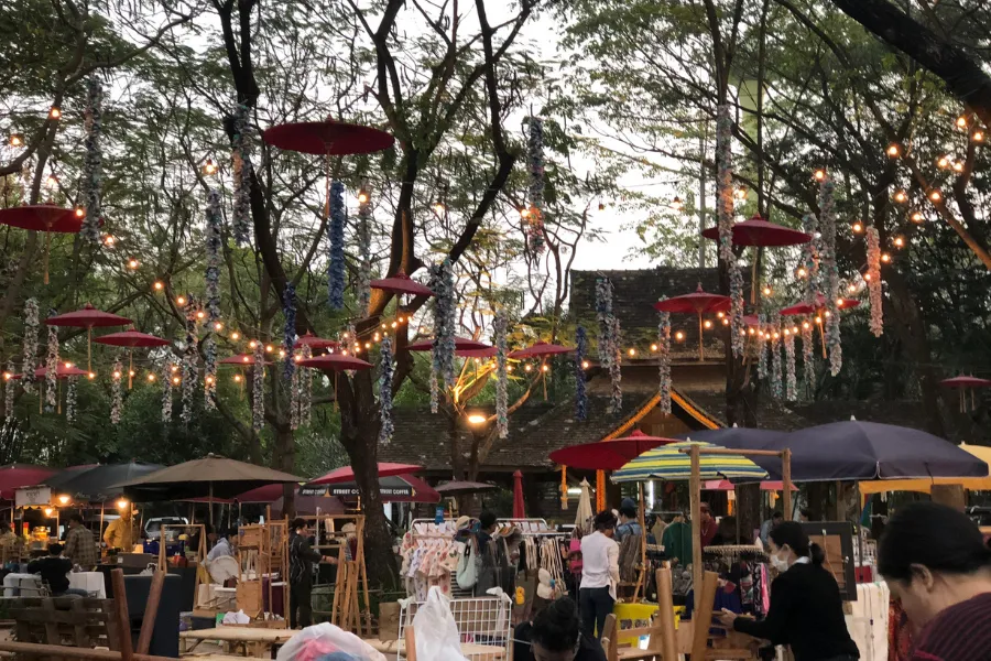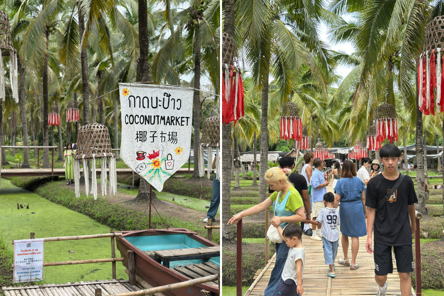対照的に、ここ2年で登場したココナッツ・マーケットは、会場デザインと観光体験を重視した全く異なるスタイルを採用しています。チェンマイ郊外のココナッツ林に位置するこのマーケットは、竹を用いて休憩所やチェックインカウンターを複数設置し、多くの観光客や若者を惹きつけています。