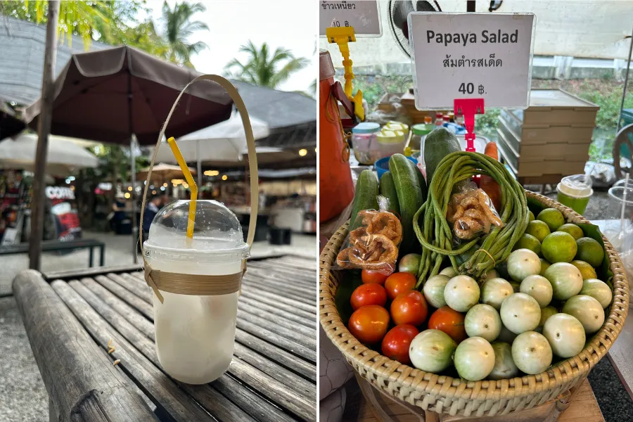 ココナッツの木々の間に点在する竹の建造物は、ツーリストたちの休憩所として、この景勝地ならではのユニークな景観を演出している。また、出店者たちは竹を割ったり削ったりして、飲み物のストラップを巧みに作り、竹の質感を日常のあらゆるところに取り入れている。店内ではさまざまなタイ料理が、ゆったりとした竹林の風景と調和し、トロピカルマーケットの風味と彩りを醸し出している