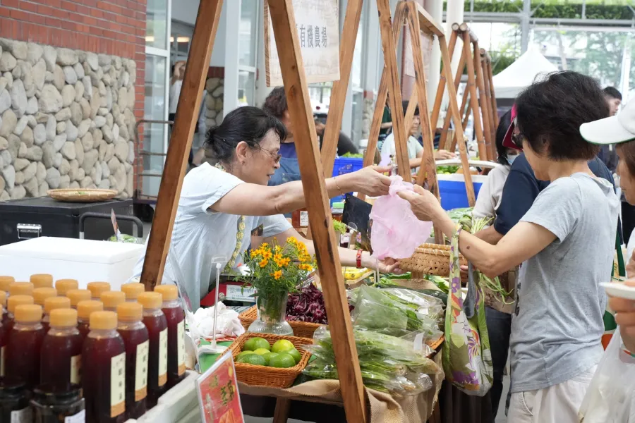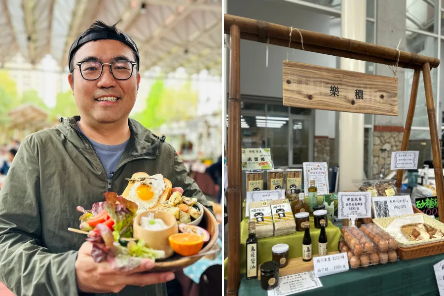 上:台北の客家文化テーマパークで開催されるウォーターガーデン・オーガニック・ファーマーズマーケット。春、秋、冬にはブランチが提供される。市場のパートナーであるグレインハートコミュニティのシェフたちは、市場で栽培された果物や野菜をふんだんに使用しており、これが市場の特徴となっている