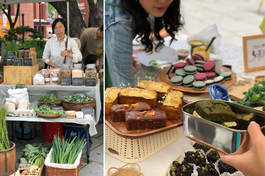 2012年に設立された韓国ソウルのマルシェマーケットは、同市で最も象徴的な都市型オーガニックマーケットです。弘益大学近くのマロニエ公園で毎月開催、コンセプトは農家、シェフ、職人の三位一体です。50から70におよぶ多様な屋台が出店し、小規模オーガニック農家、植物由来の惣菜、手作りパン、天然発酵飲料、サステナブルな工芸品などが販売されるほか、音楽、パフォーマンス、テーマ別の講演、交流イベントなども実施されています。使い捨て食器は全面的に廃止され、食器のレンタルや食器洗浄機の設置など、プラスチック削減対策を徹底しています。
