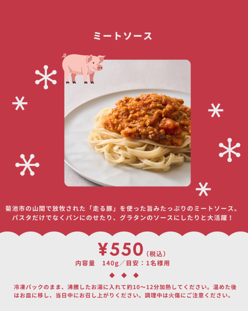 菊池市の山間で放牧された「走る豚」を使った旨みたっぷりのミートソース。冷凍保存で常備にも便利✨