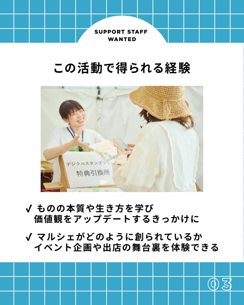 会場設営や撤去 / マルシェ本部の販売補助 / 出店者様のサポート / チラシ配布など